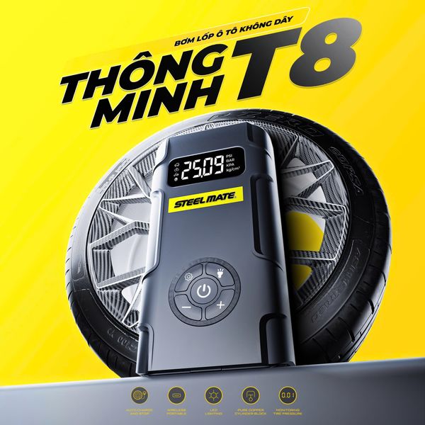 Bơm lốp ô tô không dây STEELMATE T8 là giải pháp bơm hơi di động hiệu quả, giúp tài xế chủ động duy trì áp suất lốp tiêu chuẩn, đảm bảo an toàn và tiết kiệm nhiên liệu. Với thiết kế nhỏ gọn, pin sạc dung lượng lớn, màn hình LED hiển thị chính xác và nhiều tính năng tiện ích, sản phẩm này là người bạn đồng hành đáng tin cậy trên mọi hành trình.