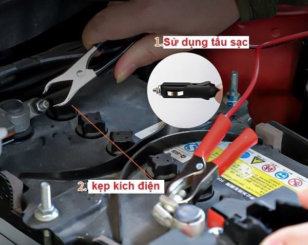 + Cách 2 : Kẹp 2 đầu bộ chuyển đổi trực tiếp vào ắc qui theo điện cực (+ -)