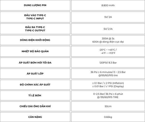 Thông số kỹ thuật kích bình đa năng T8 PRO cho thấy đây là thiết bị nhỏ gọn nhưng hiệu năng mạnh mẽ, lý tưởng cho xe cá nhân, xe máy và xe du lịch cỡ nhỏ. T8 PRO được trang bị pin lithium dung lượng 8.800mAh, dòng khởi động 300A và dòng cực đại 600A, hỗ trợ kích nổ động cơ xăng ≤ 3.0L và diesel ≤ 2.0L. Thiết bị tích hợp bơm lốp với áp suất tối đa 120 PSI, bơm từ 0–2.5 Bar chỉ trong khoảng 6 phút.