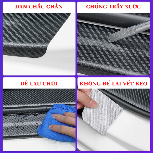 - Bộ nẹp dán vân carbon giúp chống trầy xước, bảo vệ bậc cửa và cốp xe ô tô khỏi những tác động như: bước chân, vật dụng kim loại gây xước sơn xe,…